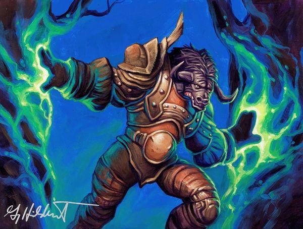 This ‘Golgari Grave Troll’ for Magic: The Gathering was made by Greg Hildebrandt, and it’s all about the surface. The texture of the troll’s skin, the way the paint looks slapped on, adds to that sense of something both menacing and kind of slapstick. Looking closer, I love how the paint seems almost crusty in places, like it's been built up layer after layer. It's not subtle or slick, but really upfront about being paint. That heaviness gives the troll a strange weight, like it might actually exist, but also maybe fall apart. You know, the way Hildebrandt handles paint reminds me a bit of how Leon Golub used to attack his canvases, roughing them up and staining them. Both artists seem interested in revealing the process of their work, laying bare the materiality of the medium, and finding new ways of seeing the world. I guess what I'm trying to say is, there's no one way to look at this.