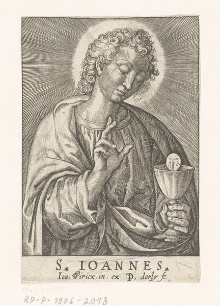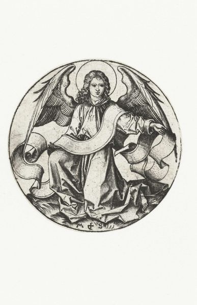 Curator: Look at the expressiveness achieved in this engraving titled "The Four Evangelist Symbols" crafted between 1455 and 1503 by Israhel van Meckenem. It resides here with us at the Rijksmuseum. Editor: It has an almost melancholic mood, don't you think? A quiet sorrow radiates from the angel's downward gaze and intricate details within this round composition. The lines are precise, and despite the subject matter it feels very human. Curator: Absolutely. The northern Renaissance artists possessed an acute skill to use intaglio engraving that often resulted in profound psychological depth, though this is only one piece representing the tetramorph. Let's remember that those four, respectively a winged man or angel, a lion, an ox, and an eagle traditionally symbolize the Four Evangelists - Matthew, Mark, Luke and John. It has much earlier roots, traceable perhaps to the Babylonian zodiac. The iconographic tradition here relies upon not just religious narratives but widespread collective beliefs, influencing its initial understanding and subsequent impact. Editor: Its widespread adoption makes it truly impressive! This particular print reveals the visual grammar available in that period, allowing religious institutions, who commissioned these pieces and disseminated this symbolism, a tremendous influence on people and on cultural identity at large. The circulation of imagery definitely dictated social understandings, from a theological to moral order, giving symbolic form to people’s deepest hopes and fears. Curator: Yes, religious imagery and other devotional objects played an outsize part in everyday medieval and Renaissance life. Van Meckenem was keenly aware of the emotional resonance symbols could achieve. Think of how memory works. Visual triggers like this angel become coded touchstones in individual minds and within the broader society as well. Each form building bridges over long stretches of history. Editor: It truly offers a fascinating portal. Analyzing it this way encourages me to reflect anew about our image-saturated culture today! Curator: Me, too. Contemplating Van Meckenem's masterful printwork definitely sheds light on both the spiritual impulses in the past and our enduring desire to seek symbolic connections even now.