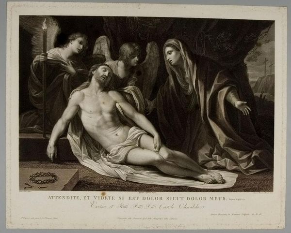 Curator: This is Jean François Ribault's "Pietà." Ribault, who lived from 1767 to 1820, captured a poignant interpretation of this iconic scene. Editor: My initial impression is one of subdued grief. The somber tonality and delicate lines create a very tender, mournful atmosphere. Curator: Indeed. The composition is masterful, guiding the eye through a careful arrangement of light and shadow. Notice the almost geometric structure of the figures. Editor: And it's vital to acknowledge the historical weight of the Pietà. Ribault's work engages with centuries of artistic representations, each reflecting societal views on motherhood, suffering, and sacrifice. Curator: The interplay between form and content elevates it. Editor: Seeing it today reminds us how themes of loss and resilience still resonate.