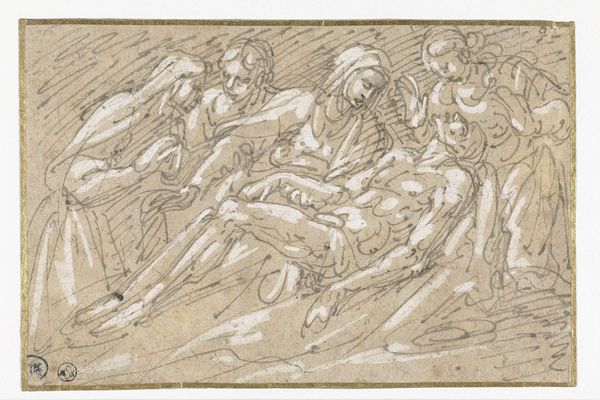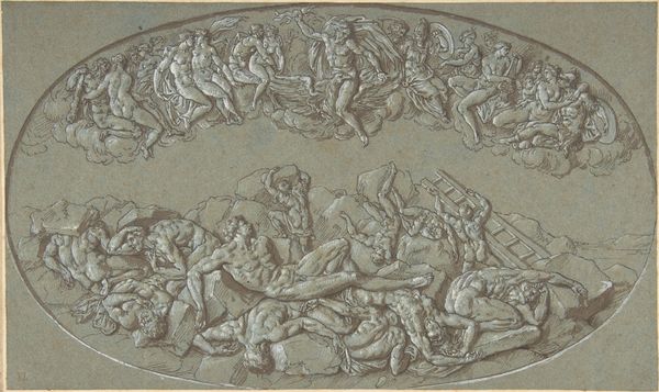 Curator: Here we have "Four (?) Nude Women in the Clouds Surrounded by Putti" a drawing by Benoît Le Coffre, made sometime between 1691 and 1722. What are your initial thoughts? Editor: My first impression is its warmth – it practically glows. That reddish chalk lends it an ethereal, almost dreamlike quality. The composition feels loose, dynamic, the figures swirling amidst the clouds. Curator: Indeed. Le Coffre was working within a deeply established academic tradition. These swirling figures, the idealized nudes, echo Baroque sensibilities while clearly demonstrating a mastery of the figure. Editor: What strikes me, however, is the immediate sense of movement achieved with what appears to be a pretty economical use of materials – red chalk on paper. The cross-hatching to build up the forms… you can practically feel the artist's hand at work. Was this drawing intended as a study for a larger piece, perhaps? Curator: It very well could be. Drawings like this would have been integral to the academic system. Artists would make countless studies of the nude figure, honing their skills, demonstrating their knowledge of classical forms. Editor: So, in a way, it's a record of labour? These marks show technical training. I wonder what the economies were around academic workshops in Paris at the time. And it looks like the paper itself may have been cut. Curator: A drawing like this offered an aspiring artist a vital opportunity to secure commissions and integrate himself into elite circles. These putti for example were common symbolic forms in royal portraiture at the time. It's hard to overstate the political and economic incentives shaping art during this era. Editor: The visibility of this preparatory process invites one to see all the layers of effort that goes into the kind of skill and image-making being fostered at academies. It makes one rethink how we traditionally assess the work of masters as something like sheer innate genius, by actually making the materials, effort, and modes of production highly visible. Curator: It’s true. Understanding this work through a purely aesthetic lens, admiring only the finished drawing, overlooks the systems of power that sustained it. We gain a much richer understanding by considering both its making and its cultural role. Editor: Absolutely. Thinking about the materials and processes helps us deconstruct the often-mythologized view of art history, no? Curator: Indeed. Now, it's hard to simply *see* without context and thoughtful interrogation.