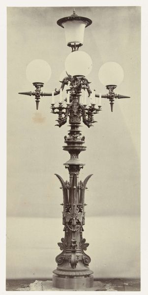 Editor: Here we have a photograph of "Vloerlantaarn met vier grote glazen bollen en een middenlantaarn, het bronzen frame is gedecoreerd," taken circa 1878-1881 by Louis-Emile Durandelle. Looking at the elaborate details, I'm struck by how much it embodies the elegance of its time. What particularly jumps out at you in this image? Curator: Oh, it's all glorious frippery, isn't it? You know, I can almost smell the gaslight emanating from those glass globes! What captivates me is how it marries the domestic and the civic – imagine this in a grand salon or illuminating a Parisian street. The lyre motif feels particularly poignant; do you think it’s a simple flourish or something deeper? Editor: I hadn't considered the lyre in detail – now that you mention it, its incorporation feels quite intentional. Perhaps suggesting enlightenment through art? Curator: Precisely! It's almost as if the lamplight is singing to us. Durandelle was a master at capturing architectural details, wasn't he? He wasn’t just documenting; he was conjuring a mood, a whole Belle Époque dreamscape, through the lens. And the crispness of the metalwork against the glowing glass? Tell me, what does that contrast evoke for you? Editor: A sense of opulence, but also the innovation of the time— the meeting of artistry and technology. I see this blend in the rigid structure supporting the soft glow of the lights. Curator: A beautiful sentiment! Perhaps an invitation, even now, to find the art that sings in our modern technology. It reminds me, sometimes beauty resides where light dances within the constraints of design! Editor: This has definitely reshaped how I see this photograph. Thanks for shining a light on those details! Curator: The pleasure's all mine! Now, go forth and illuminate the world with your own bright ideas!
