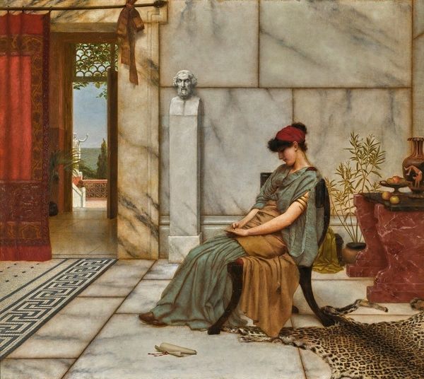 Editor: So, this is Edward John Poynter's *Helena and Hermia*, painted in 1901 using oil. I’m struck by how calm the atmosphere feels, like a still moment captured from a play, perhaps? How do you interpret this work? Curator: Indeed. And it's useful to recall that Poynter, as a keeper and interpreter of cultural memory, often used classical themes to convey emotional complexities. Note the figures themselves. Their gestures are restrained, almost ritualistic, which calls attention to their headbands: simple and timeless adornments signifying restraint and reason within the Neo-Classical aesthetic. What might these headbands suggest to you about the women and the story? Editor: I guess it's a bit about showing their intellectual power and dignity. Like symbols of elevated social standing in ancient times? Curator: Precisely! Furthermore, consider the spools, needles and textile. What might the significance of clothing and crafting be? Is this work solely interested in the feminine domesticity of ancient cultures, or is there a broader human element? Editor: I never considered the yarn. Hmm, I see it now… Perhaps the threading is a visual metaphor, illustrating life’s intricacies, like destinies interwoven. I’m beginning to grasp the importance of visual storytelling through objects. Curator: Yes. Everyday tools become a part of understanding this historical allegory. The threads trailing behind them create their destiny. Also, consider how his handling of light enhances our reading of the psychological and emotional intensity. I believe his control of light guides us. Editor: Thanks. Seeing the world of symbols around this art changed the narrative's core! Curator: That’s right: cultural symbols are all about how we learn about memory over time.