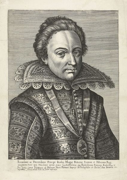 Editor: This is a rather detailed engraving, "Portret van Willem I, prins van Oranje, op 52-jarige leeftijd," dating back to 1633 by Hendrick Hondius I. The intricate details captured through engraving are astounding! The sharp lines used to describe the textures seem incredibly refined. What stands out to you? Curator: Note the portrait's oval frame, segmented by the Latin text. Observe how that text visually traps and isolates the subject within a confined space. The visual and textual components co-operate to enhance this representation. Consider also, the textures represented. What might these details suggest about the artist’s aims, or perhaps even the subject? Editor: That's an interesting point; it does give a feeling of being boxed in by words and reputation. About textures: the fur trim looks soft but weighty. The ruffled collar is light and airy, almost a halo. Perhaps the contrast emphasizes Willem’s complexity - gravitas, but also intellect and perhaps divinity. Curator: Precisely! Consider how Hondius leverages contrast – the soft fur against the crisp collar, light face versus dark background. This opposition isn't just decorative; it creates a visual hierarchy. It invites us to consider which element dominates the composition, and perhaps the character. Editor: I see what you mean. Initially, I just saw a historical portrait, but focusing on these visual tensions, I perceive how meaning emerges from these compositional choices. Thank you! Curator: A work of art is successful when its meaning and material support and reinforce each other!