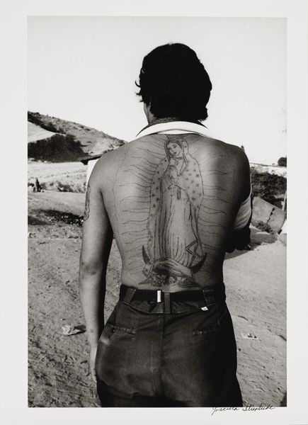 Editor: Here we have Minor White’s gelatin-silver print, "William LaRue, Pescadero, California," from 1960. I’m immediately struck by how the texture of the rock formation mirrors the lines of William’s shirt. How do you approach a piece like this? Curator: Primarily, through close observation of the formal elements. Note how the composition relies on contrasts: the smooth skin against the porous rock, the straight lines of the shirt against the organic shapes of nature. White uses tonality expertly. Editor: I see what you mean. There's a clear depth, created by the gradient of grey from light to shadow across each plane. The photograph seems very balanced, structurally speaking. Curator: Precisely. White masterfully balances the portrait with the landscape, transforming it into something beyond a mere representation. Observe the intricate details, and tell me what they convey. How does the use of black and white contribute? Editor: Perhaps the lack of color allows us to focus solely on texture and form. The contrast makes everything more distinct, wouldn’t you agree? Curator: Indeed. White highlights these aspects, pushing us beyond surface appearances to engage with the work on a purely visual level. Each formal decision guides our reading. The composition’s geometry dictates its meaning, doesn’t it? Editor: I didn’t initially think about how the arrangement carries so much meaning, focusing instead on the location, but it’s definitely the most striking element here. I am now leaving with new a understanding about formal arrangement in the artwork. Curator: Exactly. Recognizing and appreciating those choices, made by the artist, allows a far more profound appreciation, I think.