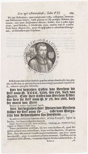 Curator: Here we have a print from 1606, “Portret van Jan van Leiden,” created by Christoffel van Sichem I, currently held at the Rijksmuseum. It’s an engraving, characteristic of the Northern Renaissance style. Editor: My initial feeling is a kind of somber dignity, despite the subject's rather infamous reputation. The sharp lines of the engraving, combined with the sheer amount of text crammed onto the page, gives it an almost... oppressive feel. What strikes you first about it? Curator: Well, the detail for one! Van Sichem really captured Jan van Leiden's...presence. Look at the intricate ruff, the details in his cloak, the way he holds that dagger – almost like a scepter. You can see that, compositionally, there is a certain formality, a kind of staged presentation meant to evoke power, despite this Jan van Leiden having already fallen. Editor: True. But there’s a vulnerability too, wouldn’t you agree? The soft modelling of his face, contrasted with the graphic rigidity elsewhere. Perhaps reflecting the artist’s complex understanding of the historical figure. Then the hat; so severe with such rounded features as Leiden’s. And is that a halo-esque feature rising behind his head? How does this fit into the narrative? Curator: Ah, you are seeing those crown and cross forms back there! Clever eye. But I interpret that as more of an attempt to cast him in an ambiguous, almost mythical light. The Reformation period, of course, was ripe with religious tension. This portrait seems to simultaneously acknowledge his power and hint at the heretical nature of his reign in Münster. It’s complicated! Editor: So it's the duality, then, that intrigues – that push and pull between perceived strength and underlying... doubt? It seems very indicative of the period. And perhaps tells us more about the society that produced the work, than it tells us of Jan. It shows us just how deeply contested every claim of power or religious legitimacy was at that moment. Curator: Absolutely. Van Sichem provides such an interesting view to what could have become an idealised image and allows us an insight that mere historical accounts alone wouldn't grant. Editor: I completely concur. To distill it down into an accessible visual form and, in so doing, opening that moment to reflection for the here and now – the piece delivers!