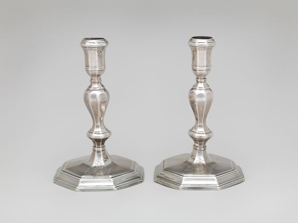 Editor: These are a Pair of Candlesticks, by Paul de Lamerie. They look like solid silver. I find their symmetry strangely satisfying. What can you tell me about them? Curator: They are indeed silver. Consider the historical context: silver, and thus light, was a luxury accessible primarily to the elite. De Lamerie was a master silversmith catering to the powerful. These candlesticks reflect and reinforce social hierarchies. How might we view such objects today? Editor: So, they represent more than just decoration. They're symbols of power. I hadn’t considered that! Curator: Exactly. Examining the art through a lens of social power dynamics opens up fascinating interpretations.