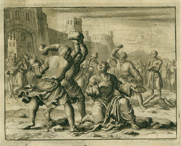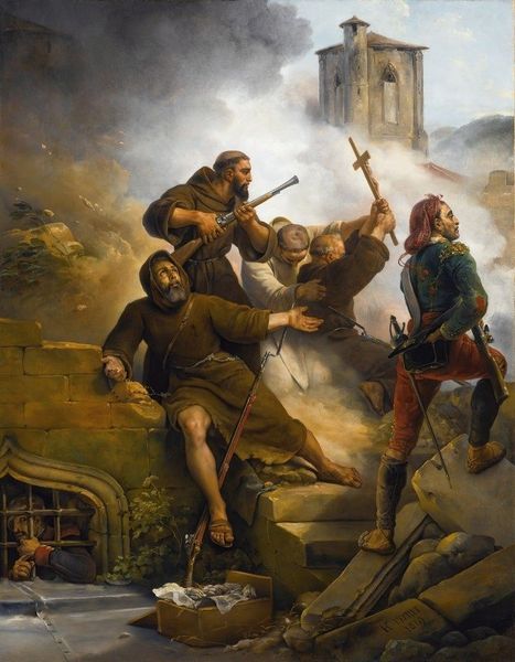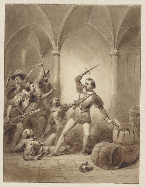 Curator: The composition certainly evokes a feeling of dusty drama. Everything seems bathed in a sepia tone, like a memory from a play. Editor: Robert Smirke painted this scene, now in the Tate collection. Smirke, born in 1752, was known for history paintings and illustrations, often tapping into literary narratives, particularly scenes from Don Quixote. Curator: Oh, definitely Quixote! The defeated knight at his feet, the crowd looking on with a mix of shock and amusement. It's theatrical, isn't it? Like a stage production captured on canvas. Editor: Absolutely. And it speaks to the 18th-century fascination with romantic, chivalric tales, but also the rise of the novel and its impact on visual culture. Smirke was shrewd in aligning himself with popular taste. Curator: It makes me wonder, though, did Smirke see himself in Quixote at all? Battling against the windmills of artistic convention, perhaps? Editor: That’s an interesting point. The image certainly encapsulates a moment of power, but also absurdity. Smirke, positioning himself within or against the establishment? The painting invites such readings, I think. Curator: It's funny, isn't it? How a single image can hold so many stories, both the one it depicts and the one it quietly implies. Editor: Precisely. It is a testament to how art intersects with literature, politics, and personal reflection, leaving us with enduring questions.