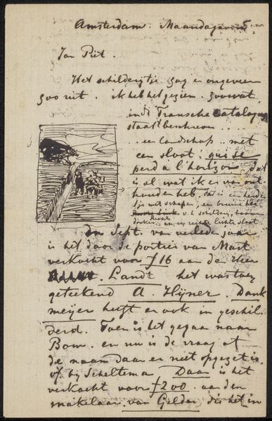 This postcard, likely created in the 1880s by Vincent van Gogh, is executed in pen and ink on paper, humble materials for a quick sketch and message. The cross-hatching and energetic lines create a sense of movement in what is a scene of toil. Look closely, and you'll see two figures digging in a field, their bodies bent in labor. The quick, sketch-like quality of the image, with the figures roughly drawn, speaks to the hard work of rural laborers and Van Gogh’s interest in portraying their daily lives. It shows that his artistic practice was rooted in an almost anthropological observation of the working classes, using accessible and portable materials. The subject matter is indicative of his desire to use his art to bring attention to those on the margins of society, and the social issues of labor and rural life. This postcard challenges any hierarchy between fine art and the lives of ordinary workers, using simple materials to elevate the everyday.