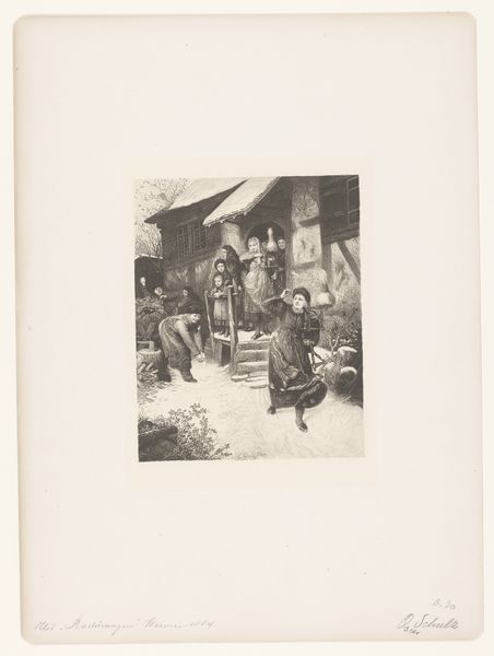 Adolphe Mouilleron created this print, titled "Lezing door de chariat van Khosrakh te Dagestan," using an unknown medium. The image transports us to 19th-century Dagestan, a region in the Caucasus, capturing a moment of cultural and religious significance. We see two men in traditional clothing listening intently as a woman reads from the Sharia, the Islamic legal and moral code. This intimate scene offers a glimpse into the social dynamics of the time. Consider the role of the woman as the reader. Does she represent a shift in traditional gender roles, or does her position reinforce existing social structures? The presence of the Sharia reading brings questions about how religious law shaped daily life, justice, and identity in Dagestan. Mouilleron’s print not only documents a specific cultural practice, but it also invites us to reflect on the complex interplay of gender, religion, and cultural identity. We’re left to consider the historical narratives and cultural values embedded within this artwork.