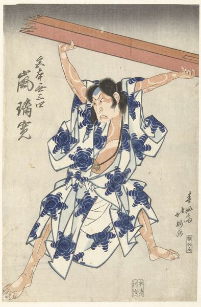 Curator: Here we have Katsushika Hokuga's "Kabuki Actor with Slice of Melon," a Japanese woodblock print. Editor: It’s visually striking. The contrasting colours and the off-kilter posture create a sense of dramatic tension. Curator: Indeed, the Kabuki actor is a potent symbol. These actors weren’t just performers, they were conduits of cultural memory. Editor: The zig-zag lines on his robe, the melon's vibrant red—they’re not merely decorative. They generate rhythm and movement. Curator: The melon could represent abundance, but in Kabuki, food is often a prop. He seems burdened, perhaps by his role. Editor: I appreciate the textures, the way the pigment settles into the paper. It draws attention to the materiality of the print itself. Curator: This image captures a particular moment in Japanese theater history, reflecting the anxieties and aspirations of the time. Editor: Ultimately, the tension between the flatness of the print and the implied depth of the figure is what holds my attention.