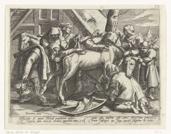 Curator: Here we have a 1613 engraving by Bartholomeus Willemsz. Dolendo, held at the Rijksmuseum, titled "De baljuw voert de koe van de boer weg," which translates to "The bailiff takes the farmer's cow away." Editor: My initial impression is one of theatrical tension, perhaps with a touch of dark humor. The exaggerated poses and the somewhat crude rendering of the figures create a strong, immediate visual impact. It looks as if the artist wants to provoke outrage toward the man seizing the cow! Curator: Indeed. The print showcases a specific social dynamic and speaks volumes about power structures in that era. The scene portrays a bailiff seizing a farmer's cow, likely due to unpaid dues, shedding light on the harsh realities of agrarian life under the Dutch Golden Age. The artist captured here a genre scene infused with a narrative element, rooted in the history painting style so favored then. Editor: Looking at the composition, the artist seems particularly interested in contrasting the figures. Notice the opulent garb of the bailiff, with its plumage and fancy trimming. Observe how that contrasts with the desperate farmer pleading with his hands, how even the very bovine becomes an emblem for this poor treatment! Curator: The visual emphasis underscores the social hierarchy inherent in the event, doesn't it? We are seeing the mechanics of injustice and maybe a glimpse into class relations during the Dutch Golden Age. The cow itself isn’t just livestock; it represents the farmer’s livelihood, brutally stripped away. Editor: From a formal perspective, the artist’s choice of engraving lends itself well to conveying this dramatic tension. The stark contrast between light and shadow amplifies the emotional intensity of the scene, really forcing the viewers to respond to what they witness. The formal choices highlight those feelings very directly. Curator: Quite right. I would argue the artwork transcends its immediate subject matter to become a commentary on broader social inequalities of the era. Dolendo compels his contemporary audiences – and indeed us – to consider the ethics of power and the plight of the common man, themes that are of continued importance today. Editor: Absolutely. What appeared at first to be simply a genre scene reveals itself to be a potent emblem for historical social injustices. The formal elements support a robust vision. Curator: I find myself pondering about the complex narrative conveyed in the detailed engraving—truly offering both historical and artful substance for reflection.