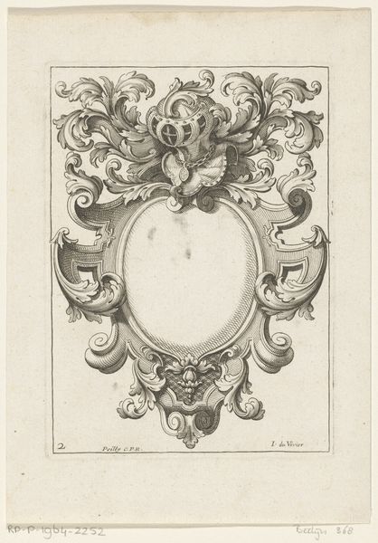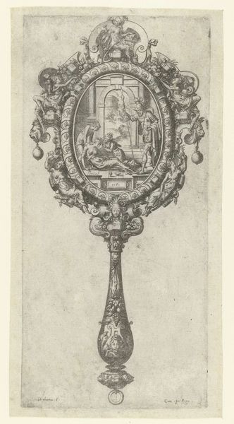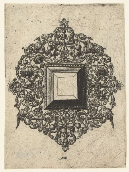 Curator: Here we have "Dubbele Hanger," or "Double Pendant," an intaglio print, likely executed with pen and engraving, dating to between 1550 and 1587. The artist, Abraham de Bruyn, really showcases the Baroque era's decorative flair. Editor: It has a formal feeling, though; very structured. The ornate scrolling almost fights against the rigid symmetry. Is that intentional, do you think, that tension? Curator: Absolutely, I think the tension you sense is exactly where meaning arises. We are meant to reflect on the contrast between a strict exterior, with the internal space being without an adornment. The form speaks of both constraint and burgeoning possibilities. Editor: So, an invitation to personalize and self-define... Given the historical context, how subversive could such an assertion of selfhood have been, particularly if considered as a adornment, a statement on one's person. Curator: Consider that pendants and jewelry of this period were often coded indicators of social status, allegiance, and religious belief. Even though "Dubbele Hanger" is an ornament design, as a print, it becomes accessible beyond the elite. Think about the democratization of symbolic representation! The implications for challenging hierarchies are there. Editor: Which moves it, doesn’t it, from just decorative art into a powerful form of commentary on personhood. This piece serves as a record of changing notions of identity that still echo today. Curator: Precisely. These swirls and geometric forms aren’t just pretty. They remind us how the wearer is both confined and empowered by cultural norms and how one can also make one's unique statement by selecting such ornament. The frame is suggestive of both. Editor: I came in seeing formality but, I appreciate you helping me understand how it functions as an exploration of identity within societal frameworks and could be viewed in today's world. Curator: My pleasure! These images really do keep on speaking if you care to listen.