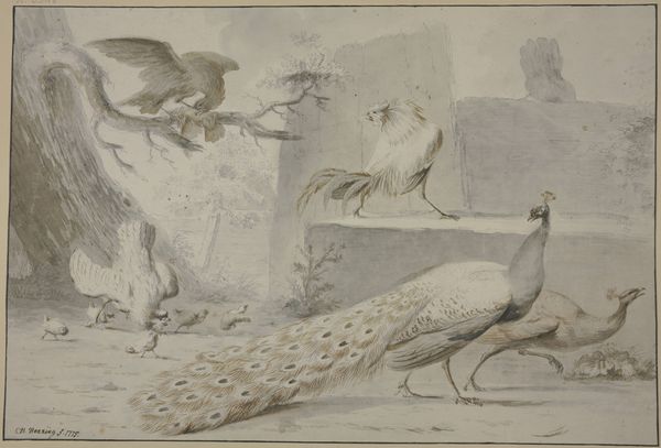 Curator: Well, this is a fascinating piece: "Havik bewaakt zijn prooi," or "Hawk Guarding Its Prey," a watercolor, pencil, and colored pencil drawing created around 1824. It’s currently housed at the Rijksmuseum. What strikes you about it? Editor: Initially, the stark reality of the food chain jumps out. It's brutal, raw—that sharp-eyed hawk over its kill feels almost… oppressive. Curator: Yes, and let's consider the cultural context here. Drawings like this, particularly of animals in naturalistic settings, gained traction as scientific illustration merged with artistic practice. Think of the burgeoning scientific societies of the early 19th century. This wasn’t simply about aesthetic beauty. Editor: True, but the "natural" setting feels deliberately composed. There’s that strategically placed tree and softly rendered background that soften the brutal act occurring center-frame. Does this soften an otherwise potentially aggressive posture? Curator: I'd argue that this composition serves a didactic purpose, rather than just aiming for aesthetics or softening aggression. What does that positioning represent in relation to nature, domination, survival? Who holds power? The drawing subtly reflects and reinforces early 19th-century views of humanity's dominion over the natural world. The museum system further supports the artwork by maintaining colonial power structures as an example for people to see everyday. Editor: That makes sense, viewing the artwork’s power from an angle of environmental activism. It makes me also wonder how such artwork affected views about class during this historical moment. Do we believe class constructs would view this predation by the bird-of-prey as a sign? How do the feathers splayed across the scene communicate status or hierarchy to diverse groups viewing this artwork then and now? Curator: Certainly, analyzing the political implications brings nuance to how we understand depictions of nature. By dissecting the intersections of colonialism, the rising capitalist structures, and class-based ideology, this natural drawing turns a harsh lens back upon us. Editor: Ultimately, it speaks volumes about the relationship between humanity and the natural order, the delicate balance and imbalances both depicted. A surprisingly loaded statement for what at first seems like a straightforward scene. Curator: Exactly! It pushes us to consider what isn't being shown, and whose voices—or squawks—are being silenced. It also emphasizes the long arc of history, showing nature itself at its own merciless whims.