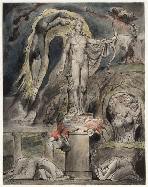 Curator: William Blake’s "A Sunshine Holiday," made around 1820, combines ink and watercolor in a phantasmagoric composition. It’s a fascinating work of Romantic imagination. Editor: My initial impression is ethereal, but there is a strangeness too. The juxtaposition of figures – the monumental figures in the sky with the dancing figures below, almost feels unsettling. There’s a dreamlike quality here. Curator: The very composition guides us. The radiant sun, ringed by smaller figures, hovers above embracing, immense forms of what appear to be a female figure cradling a male. Note how the artist employs delicate washes of watercolor, juxtaposed against the linearity achieved with pen and ink. It yields a rather unique image. Editor: How was it achieved, though? Look at the layers—the visible pen strokes defining outlines, then softened by the watercolour bleeds. There’s a real contrast of deliberate technique and almost accidental effects. It speaks to an alchemical process, as if he's trying to materialize the intangible through these combined actions and substances. Curator: The symbolic content here cannot be overlooked either. Blake often wove intricate personal mythologies into his work. Those figures may be representations of archetypal ideas or beings central to his complex system. Note the placement of these dancing figures below, perhaps celebrating some revelry. Editor: And the figures are rendered rather plainly, lacking the refined precision or grandeur present in the ethereal, floating figures, that emphasizes that they're living within more ordinary parameters—bounded by labour, ritual and tradition perhaps. Their sun-warmed merry-making seems deliberately contrasted to the detached serenity of figures on the other side of existence. Curator: Indeed, you’ve pinpointed the contrasts nicely. These formal relations—scale, technique, and visual texture—evoke a particular feeling. What emotional tone emerges for you, when all is said and done? Editor: For me, it evokes a sense of profound ambiguity. While the name evokes celebration, there is something serious at play; and seeing what Blake’s materials tell us allows us to better sense it. Curator: It has been most enlightening viewing and analyzing with you today!