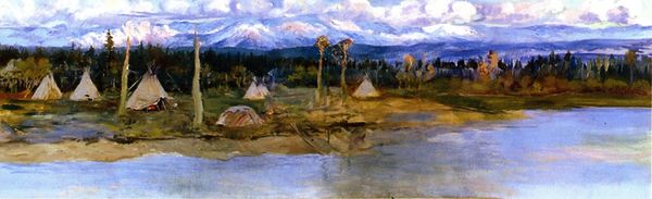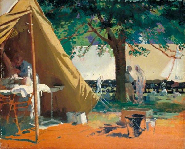 Editor: This is John Singer Sargent’s “A Tent in the Rockies,” painted in 1916, a watercolor that gives off such a feeling of transient calm. It’s so interesting to see this painter, who is often associated with portraits, take on the landscape like this. What do you see in this piece? Curator: Sargent, often seen as a chronicler of elite society, engaged with themes of leisure and travel, reflective of early 20th century social shifts. How do you interpret the contrast between the wild, untamed landscape and the tent, a symbol of domesticity and temporary settlement? It makes you wonder about land usage, ownership, and the mythology of the American West, doesn’t it? Editor: Absolutely! It seems to both celebrate and subtly question our relationship to nature. I see how the light filters through the trees. Curator: Exactly, that impressionistic touch gives the painting a sense of immediacy, of capturing a fleeting moment. It begs the question: Whose experience is centered here? Considering issues of access and privilege is essential in understanding these representations. What narratives are missing? Editor: So, by looking at this landscape we should be asking questions about who gets to access these spaces, who has the means to travel, who actually has claim to it? Curator: Precisely! And how is the wilderness constructed and consumed as a cultural ideal? Thinking about the relationship between landscape painting, colonialism, and environmental justice helps us contextualize Sargent's work critically. Editor: That’s given me a totally different perspective. Thanks! Curator: My pleasure. Always remember art reflects its socio-political contexts. Keep questioning.