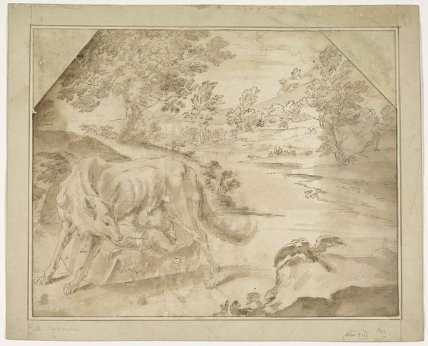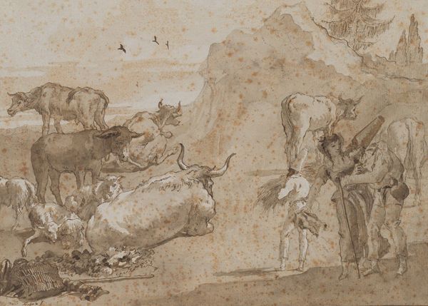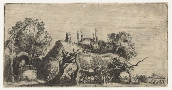 Editor: So, this is "Donkeys by a Wall," an etching, likely made sometime between 1600 and 1660, by Moyses van Wtenbrouck. It's… strangely charming, I think? It reminds me of an old fable illustration, and there's something very realistic, maybe a little comical, about the way these animals are portrayed. What do you see in it? Curator: Oh, it tickles my fancy too! It's more than just a scene of farm animals, wouldn’t you agree? This work transports me to a bygone era, when artists found poetry in everyday life, using just a few lines and shapes to bring out a wealth of detail in a small copper plate, the light caressing these beasts… donkeys of course are always up to something! What’s the story here, I wonder? Van Wtenbrouck isn't just drawing donkeys; he’s inviting us to chuckle along with them, even to feel a bit sorry for their sometimes precarious existence. Look closely, what do you think their eyes are trying to tell us? Editor: Hmmm… They look like they are watching us… or something else out of frame. It’s interesting that you use “chuckle." Is there a historical element, like a Dutch joke, maybe something lost to time? Curator: Maybe it *is* a joke! What are the implications of depicting lowly creatures at a time when the Dutch Republic had a blooming merchant class? Think of that rugged wall behind them too—it is in such stark contrast to the open space beside the donkeys and goats. Wtenbrouck gives a subtle nod to the passing of time. Editor: So the donkeys may even be stand-ins for something else… It's amazing how much can be conveyed with a simple etching. I’ll never look at farm animals the same way again! Curator: Exactly! This seemingly humble image, with just some line art, carries within it a vast field for stories and observations. Art isn’t always just about what’s on the surface.