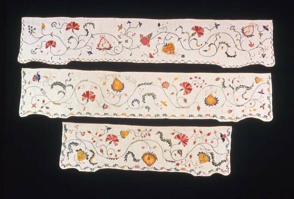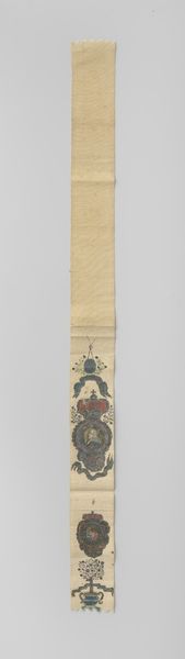 Curator: Ah, yes, "Ribbon of the Action off Dogger Bank," circa 1781. What a fascinating artifact. What are your initial thoughts about this work? Editor: It’s a long, thin textile, almost like a commemorative banner. It depicts a naval battle, but the scenes are repeated across the ribbon. It feels… muted, almost like a faded memory. How should we interpret a piece like this? Curator: Well, consider the social context. This ribbon commemorates the Battle of Dogger Bank, a significant naval engagement during the Fourth Anglo-Dutch War. But what does it *mean* to memorialize a battle on a ribbon? It transforms a brutal act of war into a domestic object, something perhaps worn or displayed. Editor: So, it's not just a celebration of victory but a way to process the conflict, making it… palatable? Curator: Exactly. This speaks to the intersection of war, nationalism, and domestic life. The ribbon normalizes violence, even aestheticizes it. How does this relate to contemporary views on the military industrial complex? Editor: It’s unsettling to think how something so seemingly innocuous could be part of a larger narrative of glorifying war. I never would have considered it that way. Curator: The beauty is in questioning the surface, isn’t it? What starts as a pretty scene on fabric turns out to be something else entirely upon interrogation. What did you learn most? Editor: I've learned that art is not detached from the world. Pieces such as this textile reveal complicated histories and can subtly reinforce cultural values.