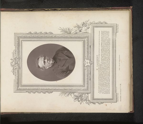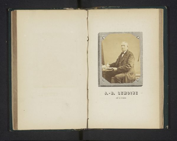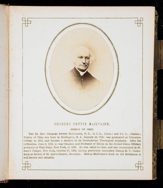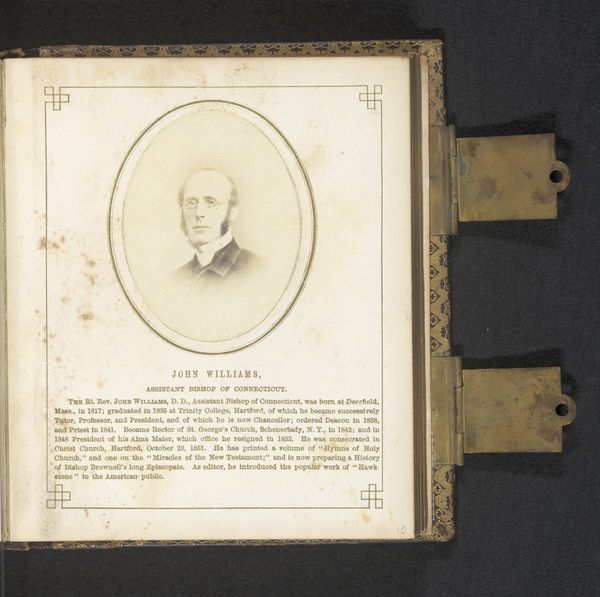 Curator: Here we have what's known as a gelatin silver print mounted on paper; it's a portrait of Jackson Kemper. J. Gurney & Son made it probably some time before 1861. Editor: Well, right away, he seems like someone who wouldn't crack a joke if his life depended on it. Serious, proper, with maybe just a glimmer of warmth hiding in his eyes? Curator: He certainly carries an air of authority. Now, what's fascinating is this oval portrait enclosed within the page. Note the metallic clasps, decorative edging, the crisp, elegant typeface… Editor: It’s almost like an ornate reliquary for an important man. I’m guessing from the text below, he was someone pretty important? Curator: Indeed. Jackson Kemper, the first Missionary Bishop of the Northwest, played a pivotal role in establishing the Episcopal Church in the American West. This book format adds an interesting layer; It could be a memorial album or perhaps a book meant for private devotion. The portrait, framed, almost suggests a saint's icon. Editor: A saint of the West, maybe! I can picture pioneers clutching this little book for solace on the long journey. It makes me think of those old family Bibles, worn soft with use and filled with pressed flowers. This portrait is sepulchral, like the photo is something alive, not just a thing. Curator: I find it evocative, the book as a vessel carrying both an image and Kemper's enduring influence across time and landscape. The symbolism speaks volumes about memory, faith, and the shaping of the American frontier. Editor: Yes, it is more than just a photo; it is relic of faith itself, you might say. A small portal, if you really consider the context. Curator: It certainly adds an element of historical intimacy to our understanding. Editor: You've given me something to ponder beyond just the image today! Thanks.