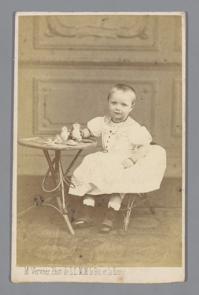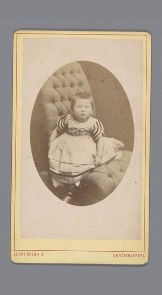 Curator: Let's take a look at "Portret van een onbekend meisje", or "Portrait of an Unknown Girl," taken between 1863 and 1866 by Auguste Blanche. It's a photograph, a form of genre painting really, with the studio listed at Photo. Anvers. Editor: It’s strikingly somber. The girl's expression feels almost prematurely world-weary for such a young face. The severe composition and the muted tones add to that impression. Curator: Well, we must contextualize it. Photography in the mid-19th century was hardly the snapshot affair of today. It was a process, an event. Think about the socio-economic implications. The child is in her best dress and clearly being presented to society. Editor: Exactly. The black stripes on the dress feel less like playful decoration and more like constraints. Note the way she clasps her hands, it suggests a certain vulnerability. And who decided that presenting girls in this precise way would promote some level of elevated societal standards? What agenda was being pushed? Curator: It highlights, though, the development of the photographic industry at that time. Blanche was running a studio in Antwerp and marketing an idealized image to the burgeoning middle class. Editor: Right, this photograph is not just about preserving a likeness but about participating in a carefully constructed visual language of class and respectability. The absence of any playfulness points to the societal pressures put upon young girls to perform and conform. Who knows if that look of anxiety wasn't simply due to standing so still for the image to come into focus? Curator: And we shouldn’t forget the inherent politics of portraiture. The very act of having one’s image taken, even an anonymous subject, was about affirming a certain social standing and participating in visual culture of the time. Editor: Agreed. The 'unknown girl' stands in for all girls presented, displayed, marketed. There are echoes of power and its performance even here, wouldn't you say? Curator: Definitely. I see this photograph as a time capsule, capturing not just an image of a child but the aspirations and anxieties of a changing society, even the subtle resistance one feels just under the surface of those times. Editor: It reminds us how art can act as a mirror, reflecting both what society wanted to see and what it often chose to ignore. A very profound artifact in that way.