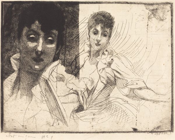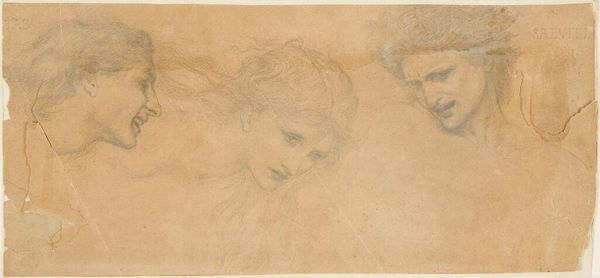 Editor: This is "Head Study for The Masque of Cupid" by Edward Burne-Jones, done with pencil and charcoal. It’s interesting how the faces seem to express such different emotions, almost like a theatrical lineup. How do you interpret this work? Curator: This drawing is so compelling! We can see here a fascinating study in emotion, deeply entrenched in the Pre-Raphaelite aesthetic of Burne-Jones. But beyond that, consider what these faces represent. One is labeled “Crudelitas,” another "Saevitia." These aren't just emotions; they are allegorical figures embodying cruelty and savagery. Editor: So, like abstract ideas given form? Curator: Precisely. And situated within the context of his planned "Masque of Cupid," we might read this not just as aesthetic exploration but as a commentary on the darker aspects of love, maybe even societal power dynamics cloaked in allegorical forms. What do you notice about the central figure, seemingly caught between these two extremes? Editor: She seems sorrowful, subdued, almost a victim to the other two... perhaps symbolizing love itself being tormented? Curator: An astute observation. Burne-Jones was deeply concerned with the way beauty and innocence are often caught in destructive power relationships, reflected in both historical accounts and societal pressures of his era, and arguably, still resonant today. He elevates these struggles to this mythological level. How does that knowledge change how you see it? Editor: It adds another layer, making me think about love and relationships not just as romantic ideals, but within real-world constraints and potential harms. It becomes more powerful. Curator: Exactly! The drawing transcends mere aesthetics and invites us to confront difficult social dynamics that persist across time. Editor: It’s been eye-opening. I initially saw faces but now it prompts wider consideration of complex societal themes reflected through a Pre-Raphaelite lens. Curator: And that, my friend, is how art history can connect the past with our present, giving voice to the silenced and illuminating unseen power structures.