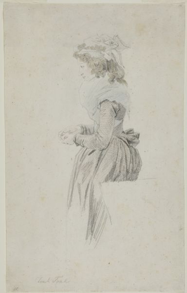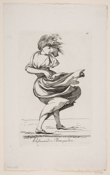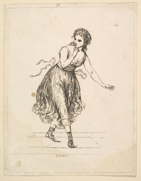 Johann Gottfried Schadow created "Woman Alone" as part of "The Dancing Pair Vigano" series using pen and black ink with gray wash. The composition emphasizes a dynamic pose, with the dancer’s body forming a diagonal axis that fills the picture plane. The flowing lines of her dress create a sense of movement, contrasted by the stillness of her upper body. The drawing uses the classical ideals of beauty through the dancer's graceful figure and measured contrapposto stance. Schadow captures a moment of transition, freezing the dancer mid-motion. Her form and placement exist within a larger cultural context where dance embodied ideals of harmony, discipline, and aesthetic refinement. Notice the artist's masterful use of line and wash to suggest form and movement. Schadow’s formal approach allows us to consider how artistic representation constructs meaning. The drawing is not merely a depiction of a dancer but an exploration of form, movement, and the body within the visual language of Neoclassical art.