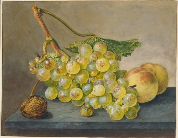 Editor: Here we have Paul Theodor van Brussel's "Fruchtst\u00fcck, Melone, Ananas, Trauben, Pfirsiche, Pflaumen, N\u00fcsse," a vibrant watercolor still life currently housed in the St\u00e4del Museum. There's almost a muted quality to the color palette, even with the variety of fruits displayed. What stands out to you as you look at this piece? Curator: What strikes me is the choice of subjects. Still lifes, particularly in the late 18th century when Van Brussel was working, were more than just representations of objects. They spoke to a growing culture of consumption, especially among the emerging bourgeois class. Can you see any links between what's depicted and socio-economic shifts of the era? Editor: I guess you could say it shows the increasing availability of different goods… pineapple feels like a particularly exotic choice, signifying wealth and access to global trade routes. But what about the rococo style—does that factor into this commentary at all? Curator: Absolutely! The Rococo, often associated with aristocracy, prized elegance and decorative excess. Placing that style in dialogue with symbols of burgeoning capitalism creates a tension. The image flirts with luxury, yet displays items accessible (to some extent) to a wider social stratum than those traditionally portrayed in art of that period. What social narratives do you think are being subtly played out here? Is this a critique, a celebration, or simply a reflection of the changing times? Editor: It is a snapshot of this tension; it doesn’t seem critical exactly, more like a pretty picture trying to incorporate the new world into its established beauty standards. Very illuminating. Curator: Exactly! Seeing it as a ‘snapshot’ is key. Van Brussel offers a glimpse into a society grappling with emerging consumerism through a traditional, visually appealing lens, reflecting its allure and the complex web of historical forces giving rise to this context.