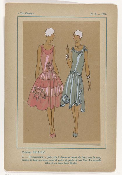 Editor: So, this is "Tr\u00e8s Parisien, 1926, No. 2, Pl. 8: Cr\u00e9ations CYBER - BACCHANTE" by G-P. Joumard, it is a pen drawing with watercolor. The color palette seems pretty limited, almost muted, yet it feels very elegant. How would you interpret this work from a formalist perspective? Curator: Indeed, the restrained palette serves a critical function here. Focus on the linearity inherent in the drawing technique, specifically the contour lines that delineate the figures and dresses. Notice how those lines, rendered with such precision, don’t merely represent form but actively construct it. What semiotic reading can be gleaned from the parallel strokes filling the dress panels, contrasting with the negative space delineating the figures? Editor: I see the strokes as decorative elements. Do you think the contrast contributes to the Art Deco aesthetic, or something else entirely? Curator: It’s about visual language. Art Deco leans heavily on geometry and repetition; observe the hemline embellishments, those echoing scallops – they embody that decorative principle perfectly. Consider how the repetition affects the piece, and contrast that against the flat areas surrounding the two figures. Editor: The flat background makes the dresses the clear focal point. Also, I didn’t think about the geometry of those lines before. Thanks for your insights. Curator: Precisely, the interplay of planar surfaces and precise linework creates a dialogue that surpasses mere decoration. The semiotic interplay elevates the piece, wouldn't you agree? Editor: Definitely, and now I'm really starting to notice those intentional design choices, such as the line weight. Thank you for opening my eyes. Curator: My pleasure. Remember, art reveals its meanings through structure, form, and their interplay, as captured within the matrix of line and shade.