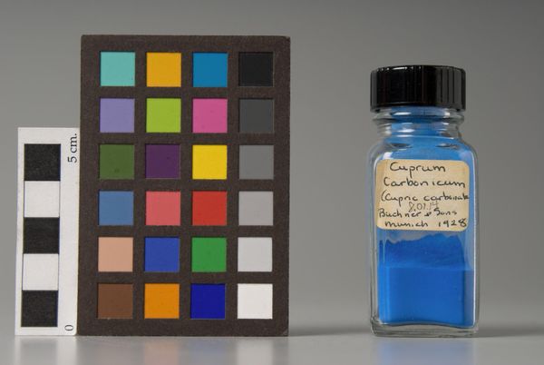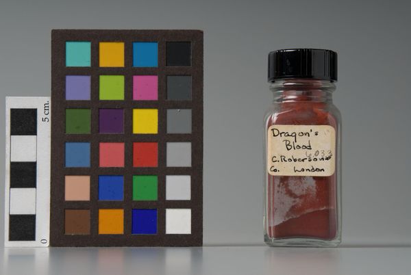 Curator: This intriguing artwork, "Laque de Garance," was manufactured by Le Franc. It's currently part of the collection at the Harvard Art Museums. Editor: My initial impression is its deceptive simplicity—a spectrum of color set against the isolated vial of pigment. Curator: The chromatic scale beside the pigment is an important, functional element within its photographic composition, not unlike the grid of a Sol LeWitt. It directs our understanding of the raw materials. Editor: Indeed. But it also speaks to the broader historical context of color production, and the commercialization of art materials. Le Franc was a major supplier to artists, shaping the palettes of generations. Curator: Precisely, the stark arrangement emphasizes the pigment's pure materiality. Editor: Looking closely, I wonder, what role did standardization play in democratizing artistic expression? Curator: A fascinating question that this piece subtly provokes. Editor: Yes, and it makes you consider the industry's contribution to artistic possibility.