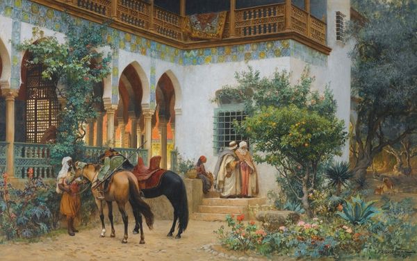 Curator: Standing before us is Frederick Arthur Bridgman’s “Scene Taken in Morocco,” painted in 1885. I’m immediately transported. The warmth of the light, the subtle details of the architecture... it feels like a memory. Editor: The scale seems off. Look at the weight of the clay jug on that boy's shoulders. That’s more than just casual ambiance; we’re looking at labor, at what it takes to sustain life in this scene. The painting appears very orientalist in style, and, as always, labor is erased or invisibilized within the painting style, but is present none the less. Curator: You're right, there's a groundedness here. The realism style pulls the romantic exoticism back down to earth, doesn't it? Look at the contrast – the lady is standing with jeweled garb is contrasted with the servant struggling with this large jug on his head. What narratives, intended or unintended, can we derive from that? It's almost like two worlds brushing against each other. I wonder about that. Editor: Right! Bridgman uses oil paint here, that is obvious by the texture and brushstroke, which would’ve been considered a "high art" medium, to depict a society seemingly untouched by industrial processes. We have horses instead of machines, and manually carried goods instead of a streamlined distribution. Consider that in contrast to the European or United States society in the same era! The subject contrasts the art style, and is something to reflect upon. Curator: Absolutely! It's interesting how we still grapple with this now, this tension between honoring craftsmanship and embracing progress, or imagining some pre-industrial paradise untouched by the harshness of reality. It gets under my skin in the most peculiar ways. It almost wants to make me yearn for a lost reality, yet celebrate current reality... contradictory! Editor: But who determines what progress is? Bridgman, a Western artist painting this "scene" in Morocco? Is it progress from whose perspective, and what materials, visible or invisible, are extracted in that progress? Thinking through art from this lens provides a stark picture of the conditions surrounding the making of this painting itself. Curator: Right! Art style, art content... they tell two sometimes competing stories. It opens this art to more reflection and interpretation! Editor: Absolutely, I am thinking about our contemporary position within this historical gaze, how things shift, and what stories can be made and unmade!