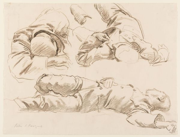 Curator: Here we have Pierre Andrieu's "Studies After Moroccan Dogs," likely dating from the late 19th century. It’s a charcoal and pencil drawing currently held in the collection of the SMK, the National Gallery of Denmark. Editor: Immediately, I’m struck by the artist’s clear fascination with the animal form. There's a real sense of quiet observation here. The tentative lines, the multiple poses...it’s intimate. Curator: The dog, of course, has been a powerful symbol across cultures and throughout art history. But how would you interpret its significance in this particular piece? And bearing in mind Andrieu’s wider position within academic artistic circles of the period? Editor: The dog here doesn’t appear as a symbol of fidelity or status. They're depicted in poses of rest and vulnerability. In Western art, dogs can signal luxury or leisure, but these seem more wild and primal. And bearing in mind the title referencing their origin, Moroccan, these are likely studies from encounters abroad, so perhaps a nod to exoticism. The artist appears keen to investigate the dog, its physical nature. Curator: Yes, and one must wonder, what’s the dog doing here? It’s a series of sketches—almost anthropological. He produced work under Delacroix – he will have likely inherited much of his political sentiment which makes you wonder about its place within colonial era ethnographic and natural history drawing? Editor: That's fascinating. I do sense that anthropological interest in form, a wish to properly record it and I do think that feeling of cultural fascination seeps through even in a sketch like this one. Even its stillness carries layers. Curator: And for me that speaks volumes about how artists engage with the world, particularly during the colonial period. Editor: It gives you much to ponder as seemingly everyday images often have more historical baggage than one might think.