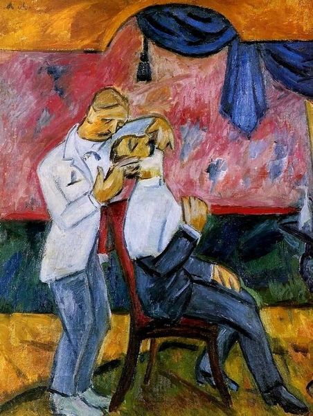 Editor: So, this is Paul Cézanne's *The Card Players* from 1896. The rich, earthy tones create a very intimate, almost melancholic mood for me. The use of oil paint gives it a wonderful texture too. What strikes you most about this piece? Curator: The materiality of this painting and its connection to the labour of everyday life are crucial. Consider how Cézanne elevates this seemingly mundane scene – two men playing cards – through his deliberate application of paint. The rough brushstrokes, the layering, almost demand we consider the physical effort, and ultimately the cultural value ascribed to leisure and manual labor in 19th-century France. Look at the fabrics, how they are built up from visible marks and think about the societal depiction of lower class compared to royalty or higher society members, like a Manet for example. Editor: That's interesting. I hadn't thought about it in terms of the men's labor but also Cezanne's. Curator: Precisely! He is showing us the texture, the weight of his own medium, almost inviting a tactile response, a challenge to painting tradition. How do we value the creation itself compared to the figures it depicts? The material itself gains significance! How different that might be to art crafted for the bourgeois home, where its 'beauty' could cover up exploitation that afforded a lifestyle where people might own art or have time for art or games? Editor: So, it's less about the realism of the card players and more about the act of making and class difference... the art market? Curator: Yes, how does Cézanne question conventional representation by emphasizing the constructed, material reality of the artwork itself? Editor: That gives me a totally different perspective on the painting; it's far more about making us question assumptions about labour and social order. Thanks! Curator: Exactly! Always question the inherent class systems and material process!