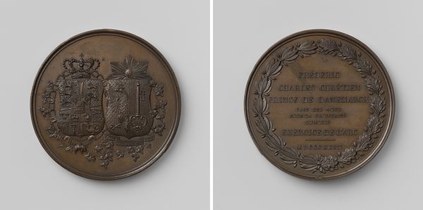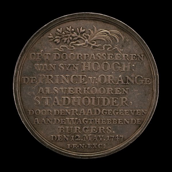 Editor: Here we have "Inscription [reverse]", a silver relief engraving by B.C.V. Calker, created in 1782. It has such a cool, formal quality with all that lettering! How should we approach this piece? Curator: Note the careful arrangement of the text, Editor. The artist uses varied line lengths to create a subtly shaped mass within the circle. How does that structured layout influence your understanding? Editor: I suppose it does lend itself to the formal tone. So the arrangement is a key feature… and the artist made that choice very deliberately? Curator: Precisely! Observe the density of the text and the considered use of negative space around the edges. What about the relationship between the text and the coat-of-arms at the top? Editor: That creates a nice visual hierarchy, separating the symbolic element from the factual inscription. It also seems like the crown floats a bit… Curator: Indeed. Notice how the engraver uses line and texture to create the illusion of depth, even in this relatively shallow relief. The precision contributes to its symbolic weight, wouldn’t you agree? Editor: It does. Thinking about the line work makes me appreciate the craft more than just reading the text. It’s more than just words; it’s a carefully constructed object. I never really thought about that! Curator: Focusing on these structural aspects allows us to look past immediate subject matter and to really examine its presence. A coin's form reflects the intentions of the work, Editor! Editor: I learned to appreciate the piece's texture and formal qualities rather than just its literal meaning. Thanks!