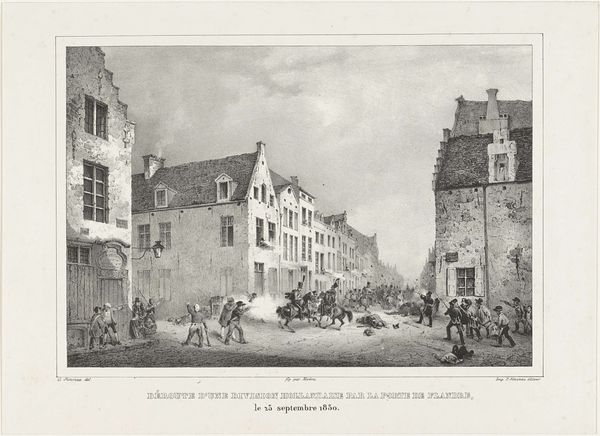 Curator: This engraving is titled "Overstroming in de Palingstraat te Vlissingen, 1808" by Izaak Jansz. de Wit. It captures the devastating flood in Vlissingen on the morning of January 15, 1808, currently held at the Rijksmuseum. Editor: My first thought is how stark and desolate it appears. The grayscale emphasizes the raw, almost brutal scene of the flooded street, with the texture of the water finely rendered to give it an eerie life-like quality. Curator: Indeed. The historical context is critical here. Vlissingen was a significant port, and this flood had serious economic and social ramifications for the community. Prints like this were vital for disseminating news and visually documenting such catastrophes, serving as a form of early media coverage. Editor: Look at how de Wit uses line weight and density to create a sense of depth. The buildings closer to us are detailed and clear, while those in the distance fade into a softer gray. It really directs your eye through the scene, accentuating the scale of the flooding. Curator: Prints like this served not only documentary, but also subtly propagandistic roles. Notice the stoicism of the people portrayed; it mirrors a desire to present resilience in the face of adversity. This resonates with the values of the period. Editor: And notice the way light reflects off the water. De Wit creates subtle patterns with his line work, which helps give the scene a sense of depth and movement, almost suggesting the unstoppable power of nature. Curator: Precisely. Considering it’s an engraving, the artist conveys the chaos of the scene while simultaneously subtly reinforcing community resolve during difficult times. The composition places the flooded street front and center, prompting collective sympathy and aid. Editor: Overall, it is really about the tension between form and content, using simple black and white lines to portray a situation that certainly was anything but. Curator: It's fascinating how it gives us a visual portal into a specific moment, serving as both historical document and a reflection of cultural resilience. Editor: It is a testament to how deeply observations of formal qualities and historical contexts can resonate to reveal a unified experience.