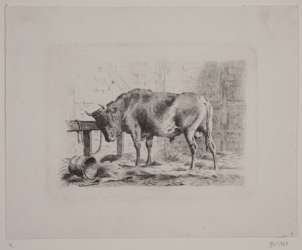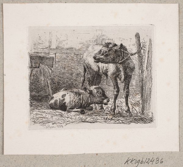 Curator: "To Kalve," or "Two Calves," is an engraving made by Johannes Wilhelm Zillen in 1847. The piece is currently held in the collection of the SMK, the National Gallery of Denmark. Editor: My immediate impression is one of starkness. The use of line, the sharp contrast of light and shadow… it’s surprisingly emotionally affecting for what is, on the surface, a simple genre scene. Curator: Absolutely. There's a compelling vulnerability evoked through these finely etched lines. Note the animal on the left lying down as if to indicate a desire for repose. I think what makes this piece more than just a barnyard study is the potent use of realism. Editor: That "realism" you point out isn’t necessarily neutral, though. The calf standing up, seemingly tethered, prompts immediate questions about control, ownership, and agricultural practice of the time. Curator: You make a pertinent point. I agree that beyond their purely representational function the subjects hold considerable symbolic potential. In this vein I argue there is something especially enduring to consider in terms of the compositional choices—the layering and diagonal presentation of the barn wall with the implement—do these architectural forms represent larger agricultural themes and issues. Editor: For me, the work acts as a conduit into the 19th century, an era increasingly shaped by industrialization. These creatures, rendered so vividly in the unforgiving clarity of the engraved line, make me think of larger narratives about our evolving relationship with the natural world. What kind of lives will they lead? What do they mean within that world? Curator: It’s an interesting tension Zillen creates between this delicate rendering and those more pointed social questions. This image of domesticity leaves us to consider what constitutes an adequate legacy from generation to generation of keepers of life. Editor: Exactly. This wasn’t merely a decorative item, this print, in its own small way, encourages conversations about labor and freedom even today. Curator: It seems we’ve arrived at what resonates across time in Zillen's piece. He holds our attention still. Editor: And challenges us to consider our historical placement regarding those images.