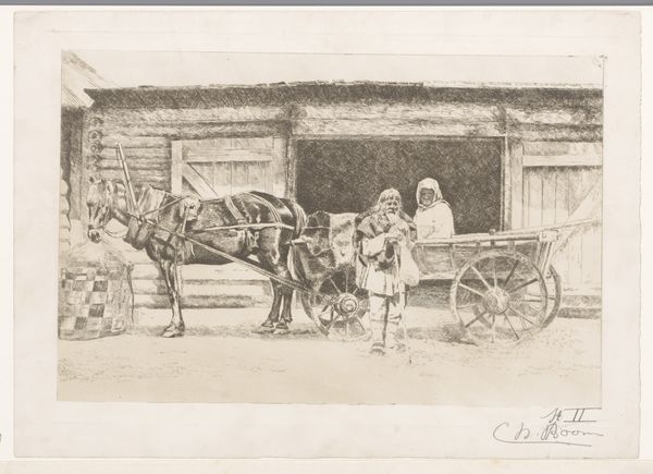 Editor: Charles Boom's "Man en vrouw met paard en wagen voor een schuur," dating from 1868 to 1909 and created with pencil and woodcut, offers an intriguing slice of rural life. I'm struck by its quiet solemnity, like a page torn from a forgotten storybook. What catches your eye in this piece? Curator: That solemnity is a keen observation. For me, the piece evokes the intimate dance between humanity and the land. Boom's delicate use of line – look closely, almost like whispers on the paper – really captures the textures of rural life. And consider the horse; isn’t it amazing how much character Boom captures? There is something innately beautiful about its simple reality. But also slightly heartbreaking, isn't it? Editor: Heartbreaking? How so? Curator: Well, the image to me seems filled with themes of mortality and labor. I always wonder what Boom wanted us to glean from their faces: contentment, fatigue, quiet resignation? How does their depiction affect you? Editor: That's a different reading than I initially had! It makes me see the figures not just as part of a landscape, but as individuals marked by their environment, if that makes sense. Maybe it's a romanticized view of peasant life. Curator: Possibly. Art is a playground of interpretations! But notice how their quiet presence dominates the scene – a quiet strength emanating despite what might be seen as hardship. Boom allows dignity and ordinariness to intertwine. So it’s about capturing those small beautiful moments that constitute lives lived, and that's more precious to me. Editor: I appreciate that; viewing this artwork now, through a perspective of labor and mortality adds new layers. Curator: Exactly. That’s why great art always seems to reinvent itself.