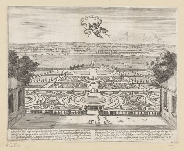 Editor: We’re looking at “View of the Tuileries Palace in Paris from the Tuileries Garden,” a print by Georg Balthasar Probst made sometime between 1742 and 1801, held at the Rijksmuseum. The layout of the gardens strikes me as meticulously planned, very ordered. How do you interpret this work? Curator: It’s a fascinating lens through which to examine power and social structures. These formal gardens weren’t just aesthetically pleasing; they were carefully constructed displays of control over nature and, by extension, society. What social groups do you think would have had access to these spaces? Editor: I imagine mostly wealthy people, nobles, maybe some merchants? It doesn't seem like a space designed for everyone. Curator: Precisely. And how does that limited access reflect the broader power dynamics of the time? These gardens, the Palace, everything speaks to the Rococo aesthetic. It’s an era where artistry and privilege intertwine. Editor: So the artwork serves as a record of who held power at that moment in time? Curator: Exactly. By visually representing this controlled environment, the artist subtly reinforces existing social hierarchies. But think, too, about the perspectives *not* included. Who built and maintained this space? Whose labor made it possible? Those stories are often erased from these idyllic depictions. Do you think an artwork like this can inspire a more nuanced conversation about social justice and historical power? Editor: Absolutely, especially if we look at it critically, asking those questions about labor and access. Thanks, I am seeing it in a new light. Curator: My pleasure! It's always about digging beneath the surface and challenging the dominant narrative.
