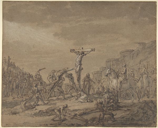 Editor: This engraving is entitled "Oprichting van het kruis," or "Raising of the Cross," by Giovanni Battista Cipriani, and dates from between 1737 and 1785. The level of detail achieved through engraving is really striking, especially considering the large number of figures. How does this historical and cultural context influence your reading of the image? Curator: Well, consider that during Cipriani’s time, history painting was seen as one of the highest forms of art, used to communicate moral or political ideas to a largely public audience. What we’re seeing isn’t just the raising of the cross; it's the presentation of power dynamics, visible through the diverse emotional responses. How do you read the body language and placement of the figures participating in this "raising"? Editor: Some are clearly laboring intensely, straining with the effort. Others on horseback seem more like spectators, observing from a distance. There’s also a group in the lower left consumed by grief, seemingly disconnected from the central action. Curator: Exactly. Cipriani has very consciously arranged these figures, their poses and reactions meant to guide the viewer’s understanding of the event. The figures, especially the central ones enacting the raising, reflect an interest in classicism popular during that period, recalling idealized forms of the body. But also consider, prints like this circulated widely. How do you think an image of such a subject influenced popular devotion and socio-political ideology at that time? Editor: I guess it allowed people to contemplate it in their homes, and shape an individual understanding of suffering and sacrifice… almost as propaganda. It brings the biblical scene to life but does it with an undeniable political slant. Curator: Precisely! And note the subtle grandeur infused in this dark moment, perhaps pointing to the institution and authority behind the message being projected here. Food for thought! Editor: Definitely gives me a different perspective on how to analyze beyond just aesthetics! Thanks for sharing your expertise.