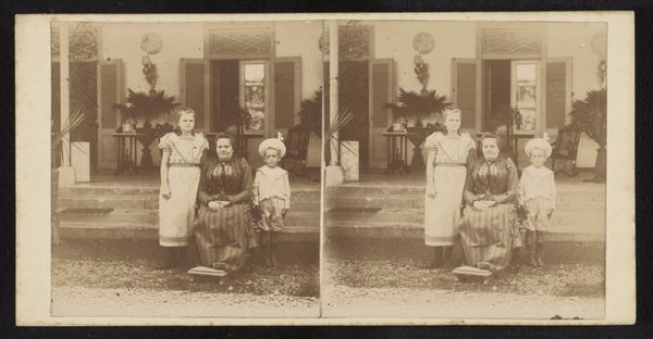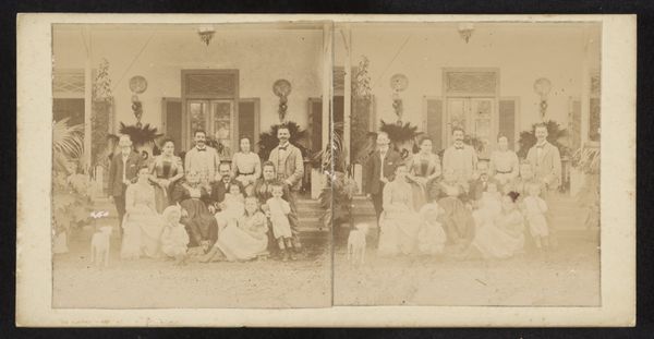 Curator: Looking at this historical photograph, its formality really stands out. I sense a strong performative aspect to the image; almost like a social requirement of the era, to display wealth and domesticity. Editor: It has an air of faded grandeur, doesn’t it? The sepia tones, the family grouped in front of what appears to be a sizable home. There’s a certain material weight even in the photograph itself. We can almost feel the coated paper used in early photographic printing. Curator: Indeed. It’s titled "Familieportret" or "Family Portrait." Robert Julius Boers likely took this between 1900 and 1922. Let's consider how this image functions within its specific historical context. Photography, still relatively novel, became a tool for solidifying social status. Note how each member is carefully posed; the clothing crisp and unblemished—everything contributing to an idealized vision of family life. It prompts us to think about race, identity, and maybe even Dutch colonialism within such portraits. Editor: I'm struck by the detail of the house itself. Note the pillars, the symmetry, and even what seems to be decorative flora on display, signs of affluence carefully curated for the shot. The entire image hinges on showing a certain quality of life—dependent on specific types of labor and resources to maintain. Who produced that emulsion for the photographer, and where did these expensive outfits come from? These details point to a system of production often overlooked in portraiture. Curator: That’s an excellent point about the labor. Focusing on these images in contemporary contexts highlights how ideas around race and class have historically been visually constructed through them. Are we seeing a truly candid representation, or one manufactured for posterity, even propaganda perhaps? And whose gaze are they trying to appeal to or impress? Editor: Exactly! I'd even add, what kinds of chemicals were necessary to process such an image at the time? Considering not just what we *see* in the photo, but what materials were necessary to make it exist—and their associated ecologies—is crucial. Curator: The act of preservation through art itself carries profound meaning—the portrait here speaks to an intention to create an identity narrative for those in the image and the context of production as an industrial manufacturing achievement. Editor: Ultimately, this photograph makes us ask, 'What gets valued, preserved, and seen…and at whose expense?’ Curator: I think approaching “Familieportret” from both angles gives a full and complicated picture. Editor: Precisely. Looking at this, I can only agree.