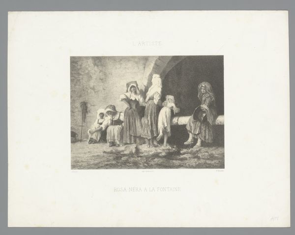Curator: I’m struck by the way light and shadow define the mood of this print. It's by Eugène Louis Pirodon, titled "Vrouwen dragen kuipen op een trap" which translates to “Women Carrying Tubs on a Staircase,” created in 1862 using the engraving technique. It evokes a sense of solemnity despite its everyday subject matter. Editor: Indeed. It’s heavy. The literal weight of the tubs mirrored by a societal weight. Women and children, clearly burdened, undertaking this labor. We have here an undeniable representation of gendered labor roles during the time. The piece subtly acknowledges the inherent class structure of the era. Curator: Absolutely, that resonates. And there's this subtle yet prevalent archetype. The maternal figure carrying life, a motif as ancient as civilization itself. Editor: Precisely. Note also how the engraving method emphasizes textures—the coarse stone steps, the fabrics. This texture combined with the strong use of light creates a sense of almost theatrical realism, though the labor itself is utterly mundane. I cannot unsee how this depiction has very close links with pre-capitalist exploitation. Curator: The women’s posture is evocative; the way they stand almost defies gravity—recalling the biblical figure of Atlas holding the weight of the world. This also invites an archetypal read as an exploration of feminine strength in the face of burdens. Editor: That posture also echoes in visual depictions of servitude and, more alarmingly, colonization: who is bearing the weight, and why? There’s also something disturbing about the almost voyeuristic composition, putting these women’s plight on display, maybe even aestheticizing their pain. Is Pirodon merely documenting, or complicit in celebrating a harmful hierarchy? Curator: These tensions create layers, undeniably. It’s difficult to strip away our contemporary critiques, while simultaneously examining through the symbol and memory lenses. Editor: Absolutely; what the artwork transmits isn't immutable; instead, it transforms through us, its interpreters, the carriers of its never-ending contemporary re-evaluation. Curator: A vital perspective! The symbolic weight of Pirodon’s engraving clearly stretches beyond its time, urging conversations about not just the work they show, but how the work represents larger historical frameworks. Editor: And how those frameworks have affected and shaped so much about the present moment. A dialogue, indeed.