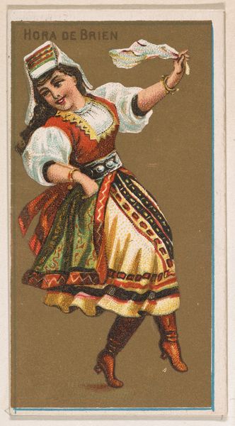 This lithograph of "Csardas" was produced by the Kinney Brothers Tobacco Company, likely in the late 19th century, as part of a series on national dances. These cards were originally included in cigarette packs. The image depicts a woman in a traditional Hungarian costume, poised mid-dance, with her hands on her hips and a confident gaze. The csárdás itself is a dance that begins slowly and gradually increases in tempo, reflecting the emotional range of Hungarian folk music. The dance became a symbol of Hungarian national identity, a cultural expression that gained prominence during a period of national awakening and political change in the Austro-Hungarian Empire. What's interesting here is the transformation of folk culture into a commodity. The Kinney Brothers, an American company, appropriated and marketed an exoticized version of Hungarian culture to sell tobacco. As historians, we can research and understand these images better by looking into the advertising strategies of the time. We can investigate the relationship between commerce and cultural representation, and the politics of imagery in the late 19th century.
