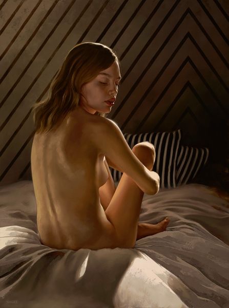 Curator: This is "Through a Window," an oil painting by Nigel Van Wieck. The piece immediately strikes me as both intimate and distanced. The stark contrast of the darkened interior against the sunlit cityscape hints at an individual caught between private contemplation and the world outside. Editor: I see a poignant representation of the female gaze. The figure is looking out, engaging with the world on her own terms. There is an inherent defiance here, a claiming of space traditionally denied to women. Curator: That's a fascinating interpretation. I'm intrigued by the composition: a female figure near a window is a very established artistic symbol. She’s nude except for the drape, positioned on the precipice of visibility, of being seen. What symbolic weight does the window hold here, would you say? Editor: The window here operates as a frame, calling attention to her agency in choosing what to look at and how to engage with the outside world. Windows have long served as powerful cultural signifiers of both connection and separation. This woman is in neither of those binaries—she’s on her own ground, observing. Her semi-nudity is not for the male gaze but rather presents a claim to self-possession. Curator: And it’s an interruption to that, surely. Her form, though gracefully rendered, possesses a vulnerability that complicates any straightforward assertion of power. She's present and embodied, and I appreciate her being positioned indoors near objects like the chair, not placed out in a symbolic, romanticized natural setting. There's this push and pull of observation that fascinates me, of how windows as mirrors reflect inward and project outward. Editor: I’d push back and argue against the traditional associations with vulnerability, precisely because those narratives are historically gendered. Her vulnerability might lie in her openness to the world, rather than any perceived lack of power. The urban landscape itself represents a multitude of intersecting lives and perspectives; a woman standing like this is her stake of claim to visibility. Curator: I appreciate you reframing that point. Van Wieck offers us a contemporary twist on a classic motif. What seems simple reveals deeper cultural complexities around domesticity, perception, and female agency. Editor: Absolutely. And perhaps the true strength of the work lies in its ability to ignite dialogue around representation and the evolving narrative of women looking at the world.