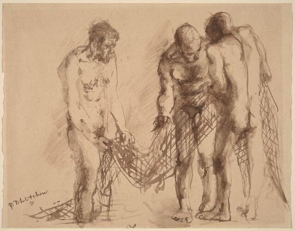 Keith Vaughn made this sepia drawing, titled 'Methods of Destruction,' with ink wash, sometime during his career. Look at the way the ink is applied; it’s almost like a stain, bleeding into the paper, creating soft edges and ambiguous forms. It feels immediate, process driven. The bodies hanging here are built up from washes of brown ink. There are very few outlines, but the light describes the forms; see how the washes on the bodies build up to create volume and shadow. Notice the way the figures and structures overlap, creating a shallow space where everything is pushed forward to the picture plane. The drawing is both immediate and ambiguous, allowing the viewer to project their own interpretations. Vaughn, like his contemporary Francis Bacon, was influenced by Surrealism and often addressed themes of alienation and the darker aspects of human nature, leaving us with an unsettling and enduring image of human suffering.