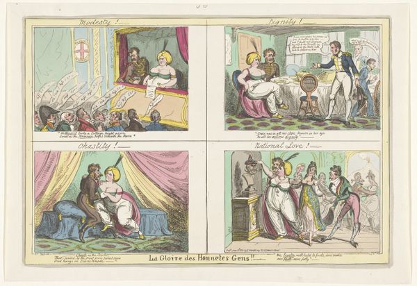 Editor: Here we have "Caricature. No. 9. 2eme Partie. Causeries du soir" from 1833, a print by Eugène-Louis Lami. It’s a charming depiction of a domestic scene, rendered in delicate watercolors. The bright pops of color amidst the more muted tones give it a vibrant yet subtly satirical feel. What do you see in this piece, considered purely in terms of its aesthetic construction? Curator: It is quite striking how Lami orchestrates this scene. Notice how the figures are positioned not in a realistic spatial arrangement, but rather as compositional elements to create visual balance. The strong horizontal of the red sofa, bisecting the image, anchors the more dynamic arrangement of figures. Consider also the lines: observe how the etching contributes a sense of depth despite the flatness of forms. The interplay of these elements creates an engaging, almost theatrical space. Editor: That’s interesting. So the balance is more about the placement of colors and shapes rather than creating a believable space. It feels somewhat artificial in that sense. Does that imply any narrative interpretation? Curator: Perhaps the artificiality is the point. While narratively one might find references to the aristocracy and domestic life in the objects displayed, my reading finds its depth residing instead in the contrast of dark and light; see, for instance, how the white dress and trousers draw the eye upwards against the red backdrop, dividing the scene horizontally into contrasting colours, the effect seems purposefully staged, which only intensifies its impact as pure visual structure. This staged quality leads us to a self-reflexive understanding of the image. How does the composition speak to you? Editor: I do find myself moving back and forth across that red line, with a similar contrast of colours and tones for the figures on either side. Thank you for that; it makes the overall image feel so much more dynamic. Curator: Indeed. Through analyzing formal structures we find that the material becomes more valuable to experience in how its colours come together.