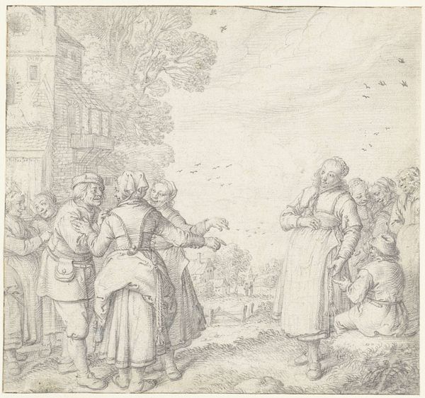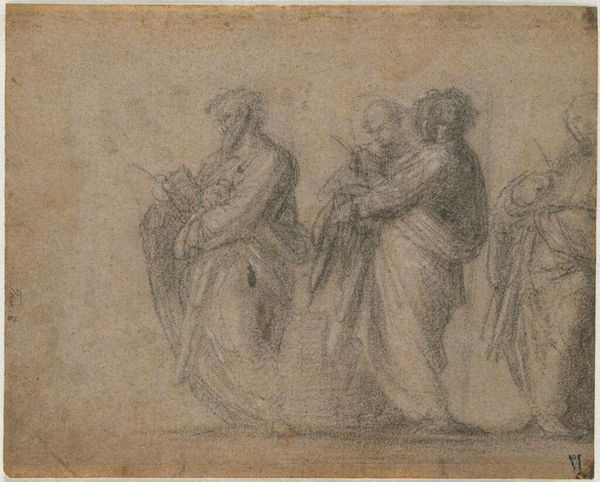 Curator: Let's discuss this compelling drawing by Nicolaas van der Worm, titled "Group of Three Women and Two Children," dating from somewhere between 1772 and 1828. Editor: My immediate impression is one of domesticity, though subtly melancholic. The grey drawing on a white background with little light has something nostalgic and even slightly unsettling about it. Is that intentional, do you think? Curator: It's a portrait, yes, but it also strikes me as an early exploration of collective identity, especially concerning women in domestic roles. The lack of clear individualization forces the audience to observe them as a family unit with distinct features based on dress and gesture. Editor: I can appreciate the focus on community, but I also wonder about the specific politics at play here. How are these women positioned within the societal power dynamics of the time? The arrangement itself is revealing, almost like an embrace that cuts you off from seeing any defining personality. Are these figures meant to represent stability or perhaps constraint? Curator: I agree. The symbolism could point in both directions. Note, however, how Romanticism shaped artistic production during this era, with heightened sentimentality becoming part of familial images that circulated among bourgeois audiences at the time. Family values in public space are valued, while motherhood gained socio-political visibility. Editor: The history of visual imagery supports your point. How were images like this consumed, and what was their role in the social construction of femininity and family at the end of the 18th century and the beginning of the 19th? This kind of portrayal inevitably upholds certain ideas of womanhood. Curator: It is difficult to say without further historical information about its patron or reception in public and domestic environments. Editor: A drawing like this forces us to remember how depictions of women’s groups are steeped in historical power dynamics, often conveying carefully curated versions of social realities. Thank you for pointing out how we can further understand this interplay today. Curator: It serves as a potent reminder that representations are not innocent. It offers new avenues for looking closely and learning through art.
