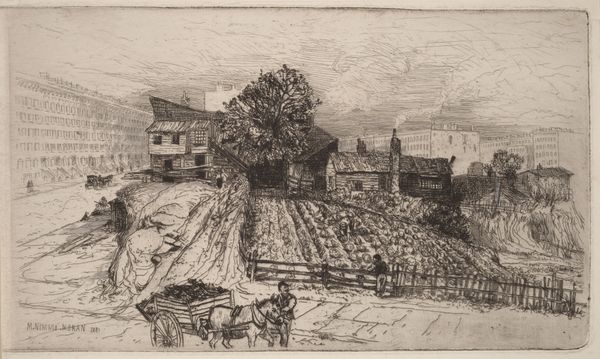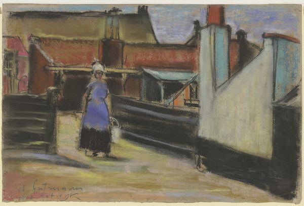 Curator: This is Wilhelm Gutmann's "Village street with cart," created in 1908. It’s currently part of the Städel Museum's collection, and rendered using pastel and drawing on paper. Editor: It gives me a distinct feeling of enclosure. The buildings seem to be pressing in from all sides. Almost claustrophobic. Curator: Expressionism often conveys intense emotion through distorted forms and exaggerated colours. Observe how the hues amplify the palpable sense of emotional intensity. The converging lines might symbolize psychological constriction within modern society. Editor: I'm struck by the quick, almost frantic strokes of the pastel. Gutmann seems less interested in accurate representation than in capturing a specific, fleeting mood. It all feels very immediate, raw. Did he use his fingers to blend in? I'd love to examine the texture of the paper. Curator: Gutmann, part of the burgeoning German Expressionist movement, embraced bold color choices to elicit emotive response and subjective experience of reality, which moved away from representational objectivity in academic art. See how the figures pushing a cart lack any sense of individualisation: archetypes trapped in an anxious world. Editor: The labor of the figures is clearly depicted but they seem detached, consumed in shadows that appear like emotional burdens that shape their interactions and existence. Curator: A poignant reflection of social angst and shifting existential states at the turn of the century through urban observation, but crafted by a tangible human presence. Editor: I’m left contemplating both the expressive and tangible qualities embodied by Gutmann’s process of pastel application, that evoke broader, deeper questions of individual emotional struggles during an era undergoing major shifts.
