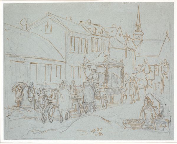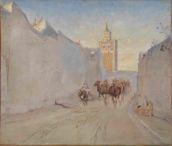 Editor: So, this is George Hendrik Breitner's "The Rokin, Amsterdam," painted between 1923 and 1925. It's an oil painting currently at the Rijksmuseum. It strikes me as incredibly bleak, a kind of frozen moment. The muted colours make the city look almost ghostly. What do you see in it? Curator: Bleak is interesting… I see the bones of the city revealed, stripped bare by the winter. Breitner’s captured a stark beauty in this everyday scene. But it’s more than just a pretty picture, isn’t it? Look at the brushstrokes. They're hurried, almost frantic. I always wonder what he was feeling at the time. What do *you* think he's trying to tell us with those wild strokes? Editor: Maybe a sense of urgency, like he’s trying to capture a fleeting moment before it vanishes? Curator: Exactly! Like memory itself fading at the edges, don’t you think? This is post-Impressionism doing its thing: not trying to make a mirror image, but to conjure the emotional landscape of the scene. That makes me ask… do you smell snow? I always do. It’s evocative that way. Editor: Now that you mention it, yes! I almost feel the chill. I initially dismissed the colours as drab, but now I see they add to that raw, wintry atmosphere. I am beginning to understand Breitner better. Curator: And isn't that the whole joy of art, my dear? That conversation between the canvas and your own soul? That little whisper it gives and lingers... and lingers.