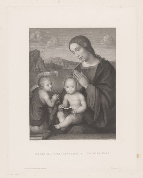 Curator: Standing before us is "Maria met Kind en Johannes," created sometime between 1829 and 1840 by Achille Martinet. It’s currently held here at the Rijksmuseum. The work is an engraving. Editor: It has an ethereal, almost ghostly quality. The gray tones lend it a somber feeling, although the grouping is intimate. The artist has captured beautiful volume and subtle contour. Curator: Absolutely. Martinet, through this print, is participating in a long tradition of portraying maternal figures in both religious and secular settings, inviting us to explore notions of motherhood and female identity, particularly within the intersectional dynamics of power during that era. This Madonna and Child grouping offers insights into prevailing attitudes about gender, piety, and familial responsibility. Editor: It’s all about line here, wouldn't you agree? The subtle hatching, the density of marks, create value and shadow...look how that cloak falls; notice the folds. I am intrigued by how much he gets from seemingly very little tonally. It's an exceptional essay in understated compositional brilliance. Curator: Certainly. Beyond line, though, there is a deliberate decision to emulate Renaissance ideals. But let’s consider the role this imagery plays within a broader socio-political context. This was a time of profound societal changes. Religious artworks like this can provide clues to understand the response, the dialogue – or pushback – against evolving gender roles. It’s more than just art. Editor: But within art, observe how the interplay of figures dominates. The way they cluster together emphasizes that pyramidical organization favored by Renaissance masters – a conscious borrowing, wouldn't you agree? Curator: It indeed suggests a dialogue with historical masters while addressing questions of historical significance and representation that hold meaning even today. What this print holds, its real strength in my view, lies not only within its formal beauty but also in its social echoes. Editor: So well put. One walks away pondering light and shadow and the structure beneath the scene... Curator: ...but, I hope, also the conversations the image initiates. It’s about our time too.