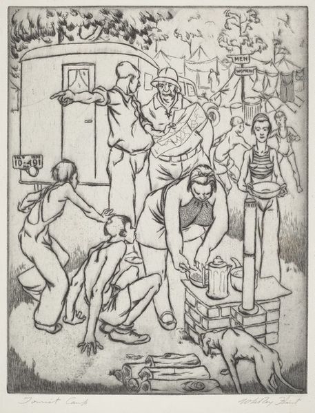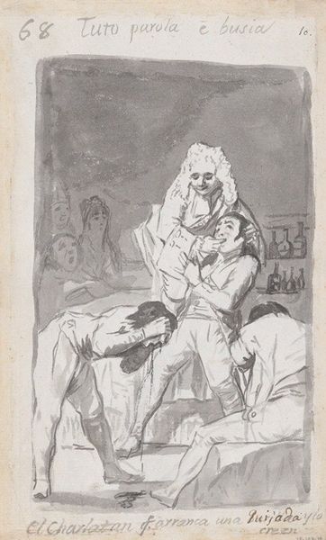 Editor: This ink drawing, "Modern Idyll" by Vasily Perov, made in 1880, is quite striking! There's almost a frenetic energy in the scene. What symbols or narratives do you think Perov is trying to convey? Curator: The overarching theme of "idyll" immediately brings to mind a specific classical tradition – a peaceful, almost utopian vision. Here, though, that idyllic image is twisted, fraught with social critique. Editor: Twisted, how so? Curator: The central figure is clearly one of power, but around him, observe the imbalance – the near-caricatured expressions, the grasping hands. Look at the prominent animals within the artwork! What do they conjure in you? Editor: The presence of both doves and birds of prey gives me an unsettling impression of the disturbance of a natural and harmonious state by an exploitative social system. Curator: Precisely. Perov cleverly uses that age-old idyllic language, flips it, and crafts a harsh indictment of his era. Do you think the historical context enriches this message, knowing the state of Russian society back then? Editor: Absolutely! Knowing the era's social tensions and Perov’s commitment to realism really adds layers to the critique, doesn’t it? Thank you! Curator: The pleasure has been all mine! Considering historical allegories through a personal lens has really amplified its inherent significance.
