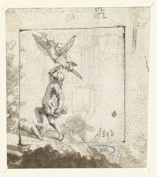 Harmen ter Borch rendered "Abraham offert Isaac" in ink on paper. The stark contrast of light and dark is central to the work’s impact. Ter Borch’s choice of ink, a humble, accessible medium, echoes the rawness of the biblical narrative. The drawing's texture isn't just about the paper's surface; it embodies the labor and time invested in each stroke. The marks on the page are a direct record of the artist’s hand. The composition emphasizes the human drama. Abraham is captured mid-action, and the angel’s intervention is immediate. The rough, sketch-like quality adds to the emotional intensity, highlighting the cost of sacrifice. By focusing on the physical act of drawing, Ter Borch imbues the scene with a sense of immediacy. It reminds us that the making of art, like any form of labor, is rooted in the material world.