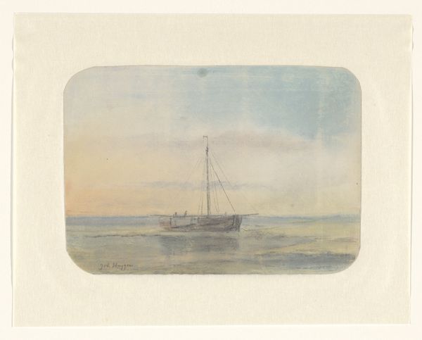 Curator: Here we have "Tweemaster op zee," or "Two-Master at Sea," a pencil and watercolor work by Johannes Huygens, dated between 1843 and 1911. It's currently part of the Rijksmuseum's collection. Editor: Instantly, I feel a sense of melancholy, don't you? The soft washes of grey and muted blues...it's a very subdued seascape, almost dreamlike. It’s giving me old storybooks from when I was a kid. Curator: Indeed. The limited palette and the blending of pencil with watercolor create a hazy, almost ethereal atmosphere. Considering the artist’s use of these materials, there’s also the inherent labor involved. Each layer contributes to the final effect, suggesting time and intention invested into production. Editor: Right! It feels layered, like memories fading and reforming. It is as if I am on that ship, experiencing that lonely, maybe ominous voyage firsthand. Curator: The technique does emphasize the precarity and often lonely existence of maritime labor. Moreover, the ship becomes almost secondary; a vehicle, like many others throughout its epoch, of both commerce and global dominance. Its purpose, ultimately, shapes how we consume and understand such art. Editor: Yes, exactly! Beyond the raw experience of nature, which is beautiful in itself, I see stories being written, the making of lives. It captures not just a ship, but a destiny setting sail. It feels… pregnant with untold narratives. It invites one to meditate upon where it’s headed. Curator: I see your point about potential narratives! Huygens offers us not just a pretty picture but a potent combination of labor, the maritime industry’s presence and reach, and a material snapshot of Holland’s own engagement with the world at the time. Editor: So well put. Thank you for connecting my feelings to something grounded! Curator: It’s what the artwork called out for. Thank you for providing us with this introspective look into such a time period.